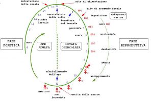 In blu: sviluppo dell’ape: i numeri indicano i giorni di distanza dall’opercolatura.
