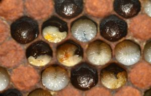Questa massa, seccandosi, forma una “scaglia” di color ruggine scuro simile a quella della peste americana ma, a differenza di quest’ultima, è facilmente asportabile dalla celletta. La covata nel suo insieme si presenta non compatta, con celle contenenti larve ingiallite, morte. Possono essere presenti odori di diversa intensitĂ , in funzione dei batteri presenti. Il M. plutonius, porta ad una covata che emana un odore acido, con larve flaccide ma integre; se però è associato al Bacillus alvei, la covata si presenta putrida ed emana un odore sgradevolissimo con larve liquefatte (ma non filamentose come nella peste americana). Esistono anche forme intermedie e forme in cui i favi non emanano alcun odore. Quando la patologia non è particolarmente avanzata, le api, specialmente se si sostituisce la regina e ci si trova in un periodo dell’anno favorevole (con presenza di abbondanti fioriture), possono riuscire a ripulire tutte le celle dalle larve colpite e la malattia può regredire spontaneamente fino a scomparire, evitando così che il contagio si diffonda al resto dell’apiario.