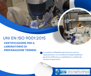 L’Istituto Zooprofilattico Sperimentale Lazio e Toscana “M. Aleandri” ha ottenuto la certificazione UNI EN ISO 9001:2015 per il Laboratorio di Preparazione Terreni, struttura tecnica strategica a supporto delle attività diagnostiche e microbiologiche dell’Istituto.
