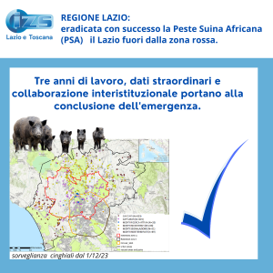 Il Commissario Straordinario dell’IZSLT, Dr. Stefano Palomba, ha dichiarato: “Questo importante traguardo rappresenta il frutto di un’efficace collaborazione tra le Istituzioni gli Enti locali e i professionisti del settore. L’azione sinergica e coordinata, garantita dal diuturno supporto dell’Autorità politica, ha consentito di marginalizzare e bloccare la diffusione della Peste Suina Africana nella Regione, garantendo la Salute Pubblica e la sicurezza sanitaria del nostro territorio.”