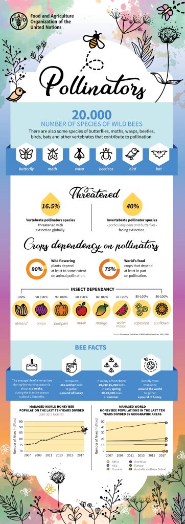 Tali documenti, ricordano come esistano al mondo più di 20.000 specie di api selvatiche e molti altri insetti o vertebrati che garantiscono l’impollinazione delle piante. Il 40% degli insetti impollinatori è, comunque, a rischio di estinzione. Le api mellifere rivestono un ruolo essenziale nell’impollinazione delle piante entomofile. Le statistiche FAOSTAT evidenziano nell’ultima decade un trend in continua crescita del patrimonio mondiale di alveari ed è il continente asiatico quello che ha registrato il maggiore incremento numerico (arrivando a possedere da solo più della metà degli alveari). Non a caso, è proprio l’Asia il più grande produttore mondiale di miele, così come descritto nella rispettiva infografica.