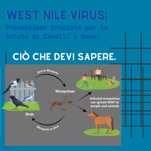 La West Nile Disease o West Nile Fever o Febbre del Nilo Occidentale è una malattia zoonotica virale causata da un virus a RNA appartenente alla famiglia delle Flaviviridae, genere Flavivirus. Questo virus, trasmesso dalle zanzare del genere Culex, è mantenuto in natura dagli uccelli selvatici. Per quanto concerne gli uccelli solo alcune specie sviluppano delle forme sintomatiche (cicogne, corvidi, oche) che anche in questo caso sono caratterizzate da forme neurologiche in alcuni casi ad esito letale. L’uomo e il cavallo possono infettarsi occasionalmente ma sono considerati degli ospiti a fondo cieco. Dal 2008 in Italia la circolazione del WNV è rilevata ogni anno, soprattutto nel periodo estivo-autunnale in zanzare, animali e uomo, grazie alle attività di sorveglianza integrata, definite dal Piano Nazionale di Prevenzione, Sorveglianza e Risposta Arbovirosi. In particolare, la sorveglianza nei confronti del virus della West Nile è condotta sull’uomo e sulle zanzare, uccelli e cavalli al fine di individuare il più precocemente possibile la circolazione virale in un territorio e, quindi, mettere in atto tutte le misure utili a limitare il rischio di trasmissione dell’infezione in particolare all’uomo e al cavallo. L’infezione negli equidi ha un periodo di incubazione della durata di 3-15 giorni e l’insorgenza dei sintomi è preceduta da una viremia di scarsa intensità. Nella maggior parte dei casi l’infezione è asintomatica, circa il 10% dei soggetti infetti sviluppa sintomatologia neurologica caratterizzata da sintomi come riportati in elenco: